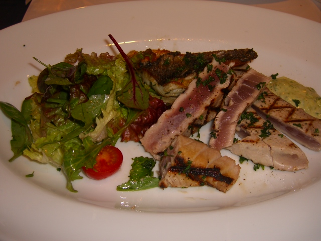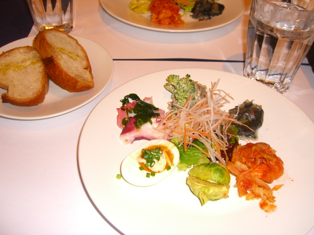 左の写真は前菜、蛸やお魚のマリネや、貝がとてもおいしい!