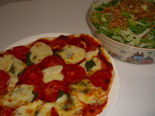 生地をのばす所からしないと、分厚いピザに成っちゃうでしょ。市販のクリスピーよりまだまだ薄いはずなんだけど・・・。で、チーズも少し控えめ。カロリーを抑えているつもりでも3枚は多すぎる?(ーー;)