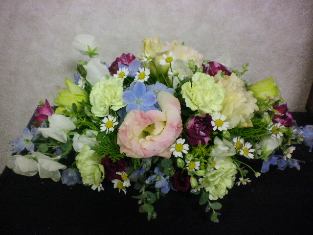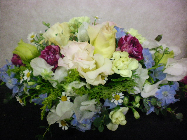 テーブルの上に、フラワーアレンジメントがデン!と