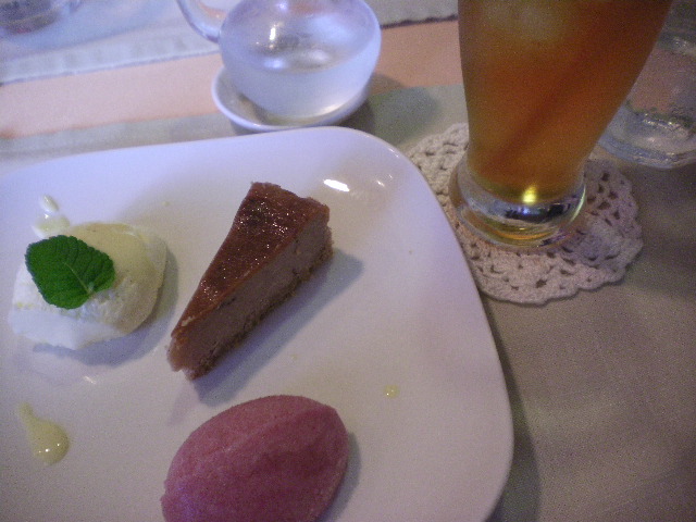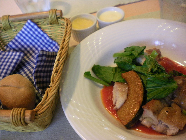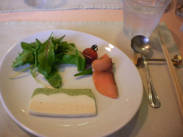 冷たいスープも付いてて、メインはお肉かお魚を選べます。